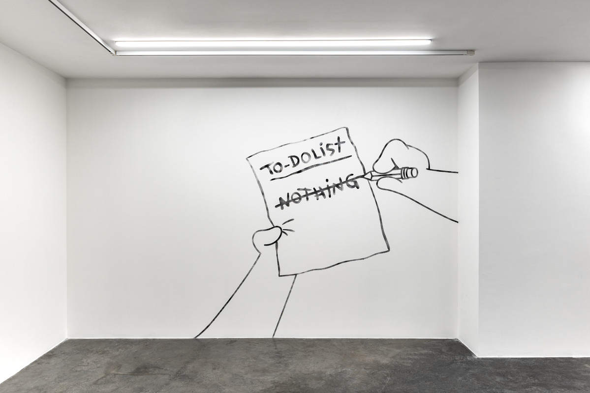 The exhibition, which considers cave art as the first example of artistic expression, features two memes applied on the gallery walls: To-Do List: Nothing and Nobody Cares (2020). The memes with an absurd humor that spread quickly on online platforms, transform existing images to deliver a message that is different than its original. Tuncay applies the Nobody Cares meme on the gallery’s wall, featuring the cartoon character SpongeBob holding a psychedelic rainbow. The artist makes reference to a 30 thousand years old technique: He uses tempera and charcoal to mix the paint, then he blows the paint through a straw making negative and positive prints on the wall. Another well-known meme from the series SpongeBob SquarePants, “To-Do List” with the word “nothing” is crossed out, is applied on the wall with the same technique. Applying this preliminary and primitive technique on the gallery wall hints on humanity's desire for a cultural continuation.